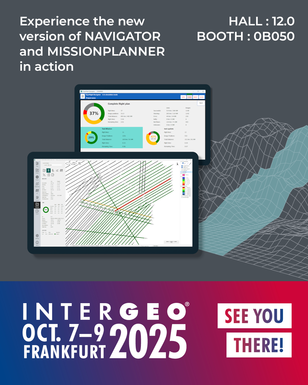 We are thrilled to announce that our team will be exhibiting at INTERGEO 2024 in Stuttgart, taking place from September 24 to 26. This year, we will be showcasing two exciting developments—our newly released MISSIONPLANNER and NAVIGATOR software solutions, designed to revolutionize your flight planning experience.